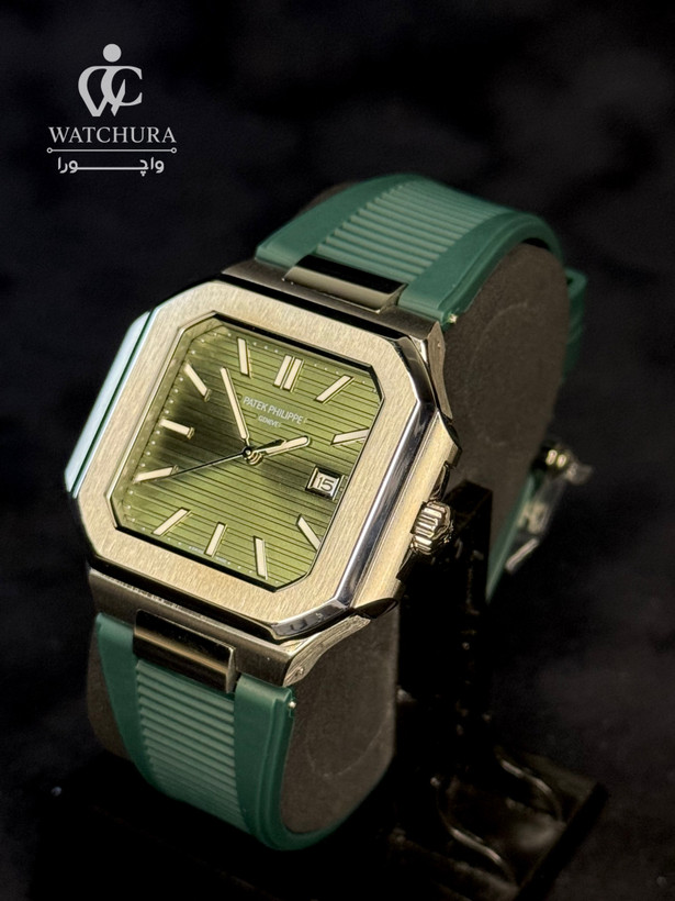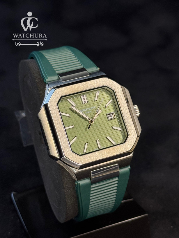 این ساعت پتک فیلیپ، با فرم قاب منحصر به فرد خود که ترکیبی جسورانه از مربع و هشتضلعی (شبیه به مدلهای برجسته لوکس اسپرت) است، تعریفی مدرن از لوکس بودن را ارائه میدهد. قاب استیل صیقلی، به زیبایی با صفحه سفید رنگ بافتدار هماهنگ شده است. صفحه دارای نشانگرهای ساعت برجسته و ساده است که خوانایی را در کنار زیبایی حفظ کردهاند. مهمترین ویژگی اسپرت این مدل، بند رابر (سیلیکون) مشکی رنگ آن است که راحتی فوقالعادهای را برای استفاده روزانه، سفر و فعالیتهای ورزشی فراهم میکند، در حالی که ماهیت لوکس برند حفظ شده است. این ساعت، انتخابی بینظیر برای افرادی است که به دنبال یک ساعت لوکس سوئیسی با طراحی مدرن، اسپرت و متفاوت از مدلهای سنتی هستند.
