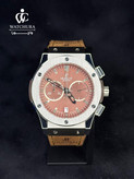این ساعت مچی Hublot Geneve، ترکیبی بینظیر از قدرت، دقت و لوکس بودن اسپرت است. طراحی برجسته با صفحه قهوهای و قاب استیل خشدار، ظاهری مدرن و جسورانه به آن بخشیده است. این کرونوگراف ابزاری کارآمد برای اندازهگیری زمان است و بند چرمی جیر با دوخت صنعتی ، راحتی و دوام را تضمین میکند.