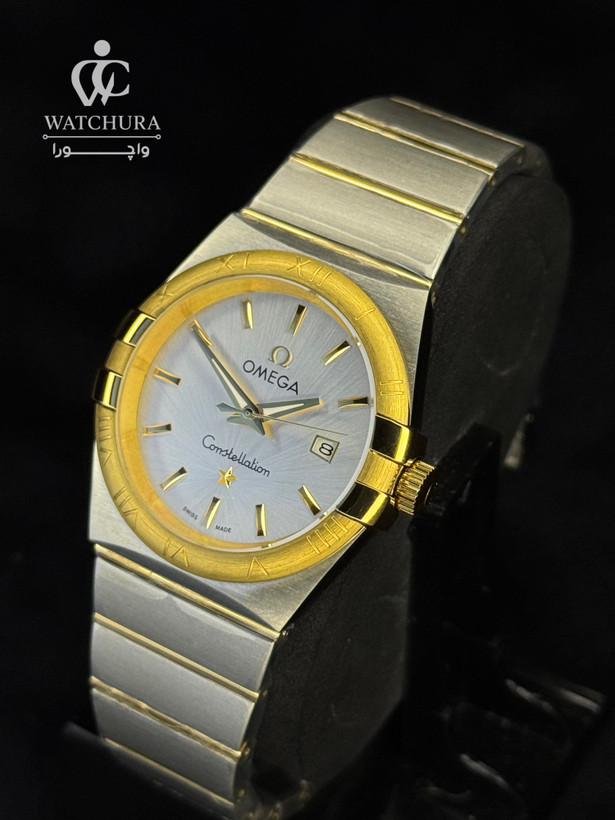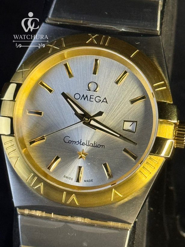 این ساعت، یک نمونه فوقالعاده از مدلهای مشهور Omega Constellation است که تلفیقی از سنت و تجمل را به نمایش میگذارد. ترکیب رنگ دو رنگ (Two-Tone) شامل استیل ضدزنگ و جزئیات طلایی رنگ (بر روی قاب و پنجههای نمادین) به آن ظاهری بسیار لوکس و چشمگیر داده است. شاخصترین ویژگی این مدل، صفحه درخشان استیل به همراه نشانگرهای خطی است که شکوه و درخشش بینظیری به ساعت میبخشد. وجود تقویم روزشمار و ستاره معروف Constellation در پایین صفحه، اصالت و دقت این برند سوئیسی را تأیید میکند و آن را به یک اکسسوری ابدی برای آقاهای شیکپوش تبدیل میکند.