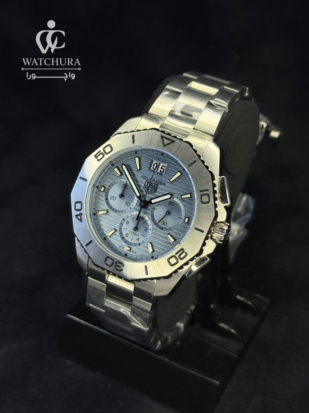 این نسخه از تگ هویر آکوآریسر با صفحه آبی یخی (Ice Blue) خود، نسیمی تازه در دنیای ساعتهای اسپرت لوکس محسوب میشود. رنگ آبی خاص وروشن این مدل در کنار بافت خطوط افقی صفحه، جلوهای مدرن و منحصر به فرد به آن بخشیده که به راحتی در هر جمعی متمایز میشود. ویژگی فنی شاخص اینمدل، نمایشگر Big Date (تقویم بزرگ) در موقعیت ساعت ۱۲ است که در کنار چیدمان دقیق سه موتوره کرنوگراف، توازنی بینظیر میان کارایی و زیبایی ایجادکرده است. بدنه و بند تمام استیل صیقلی، این ساعت را به انتخابی جسورانه برای افرادی تبدیل کرده است که به دنبال ساعتهای کلاسیک با رنگهای ترند و خاصهستند.