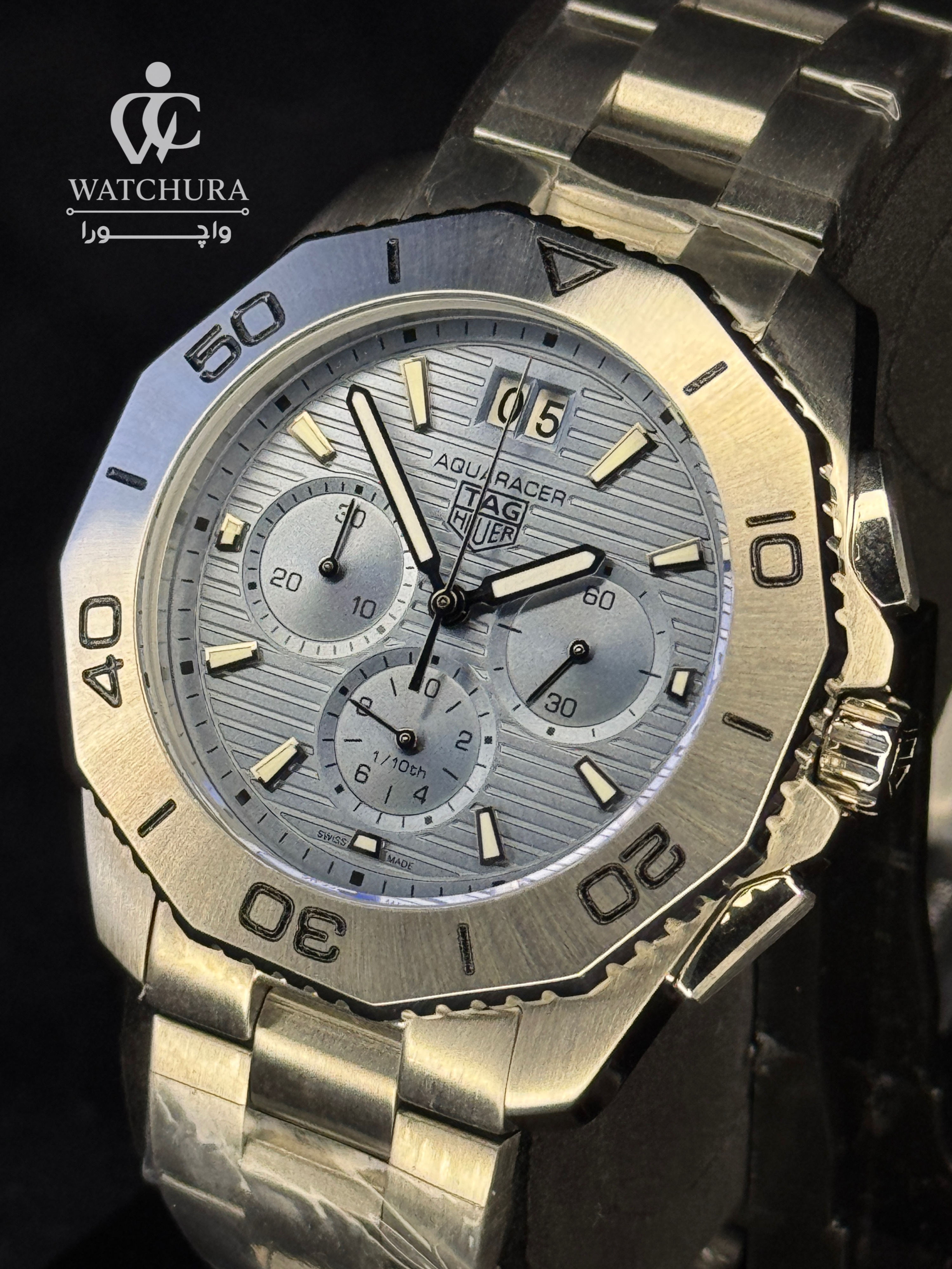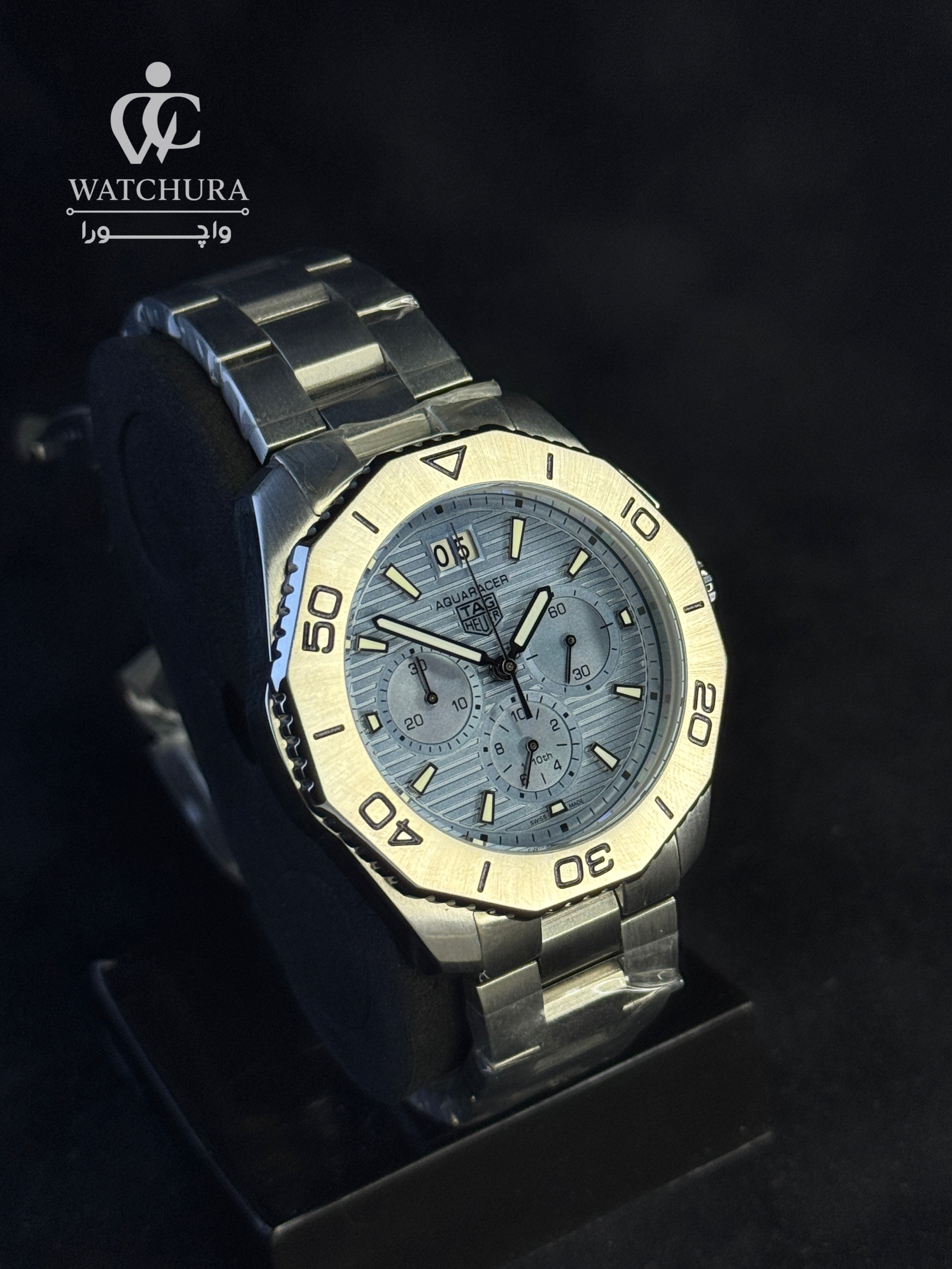 این نسخه از تگ هویر آکوآریسر با صفحه آبی یخی (Ice Blue) خود، نسیمی تازه در دنیای ساعتهای اسپرت لوکس محسوب میشود. رنگ آبی خاص وروشن این مدل در کنار بافت خطوط افقی صفحه، جلوهای مدرن و منحصر به فرد به آن بخشیده که به راحتی در هر جمعی متمایز میشود. ویژگی فنی شاخص اینمدل، نمایشگر Big Date (تقویم بزرگ) در موقعیت ساعت ۱۲ است که در کنار چیدمان دقیق سه موتوره کرنوگراف، توازنی بینظیر میان کارایی و زیبایی ایجادکرده است. بدنه و بند تمام استیل صیقلی، این ساعت را به انتخابی جسورانه برای افرادی تبدیل کرده است که به دنبال ساعتهای کلاسیک با رنگهای ترند و خاصهستند.
