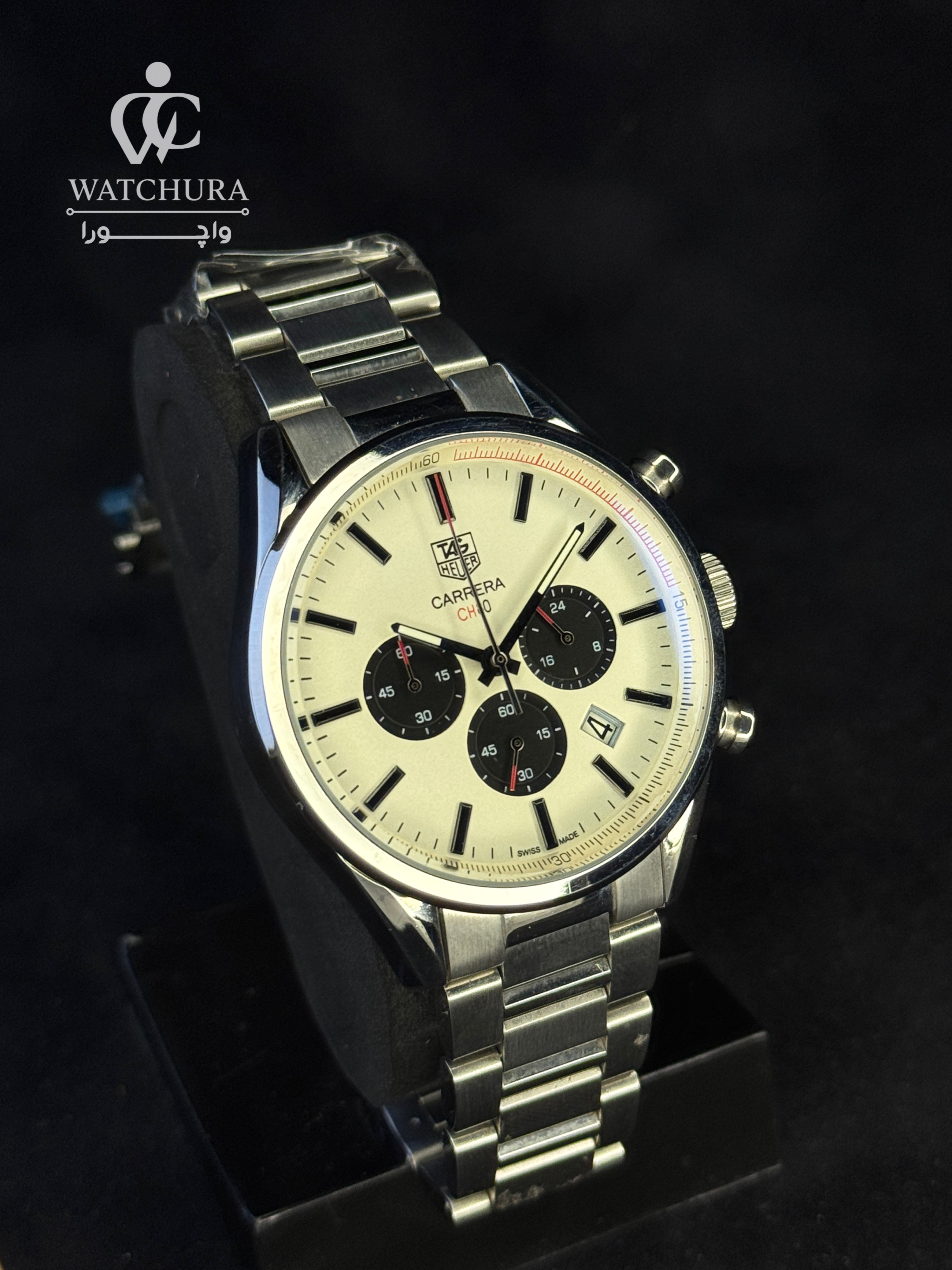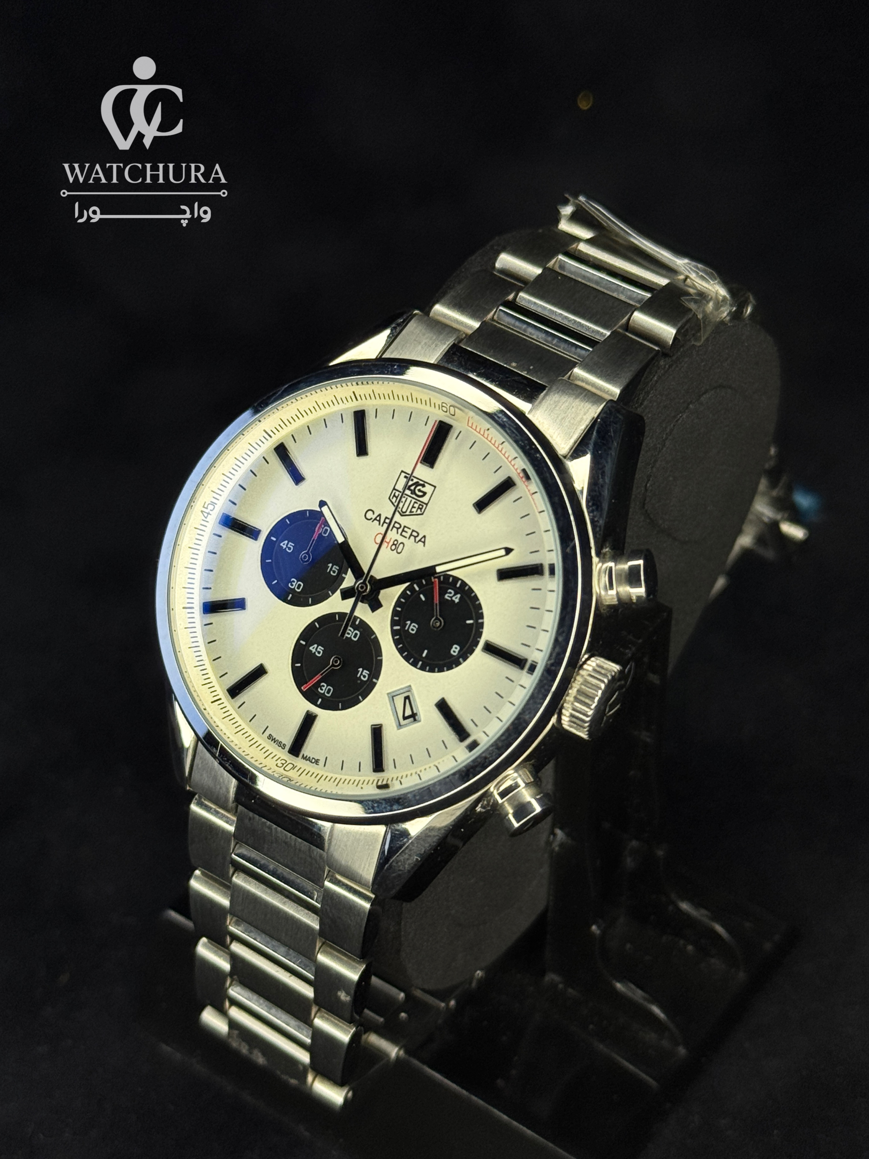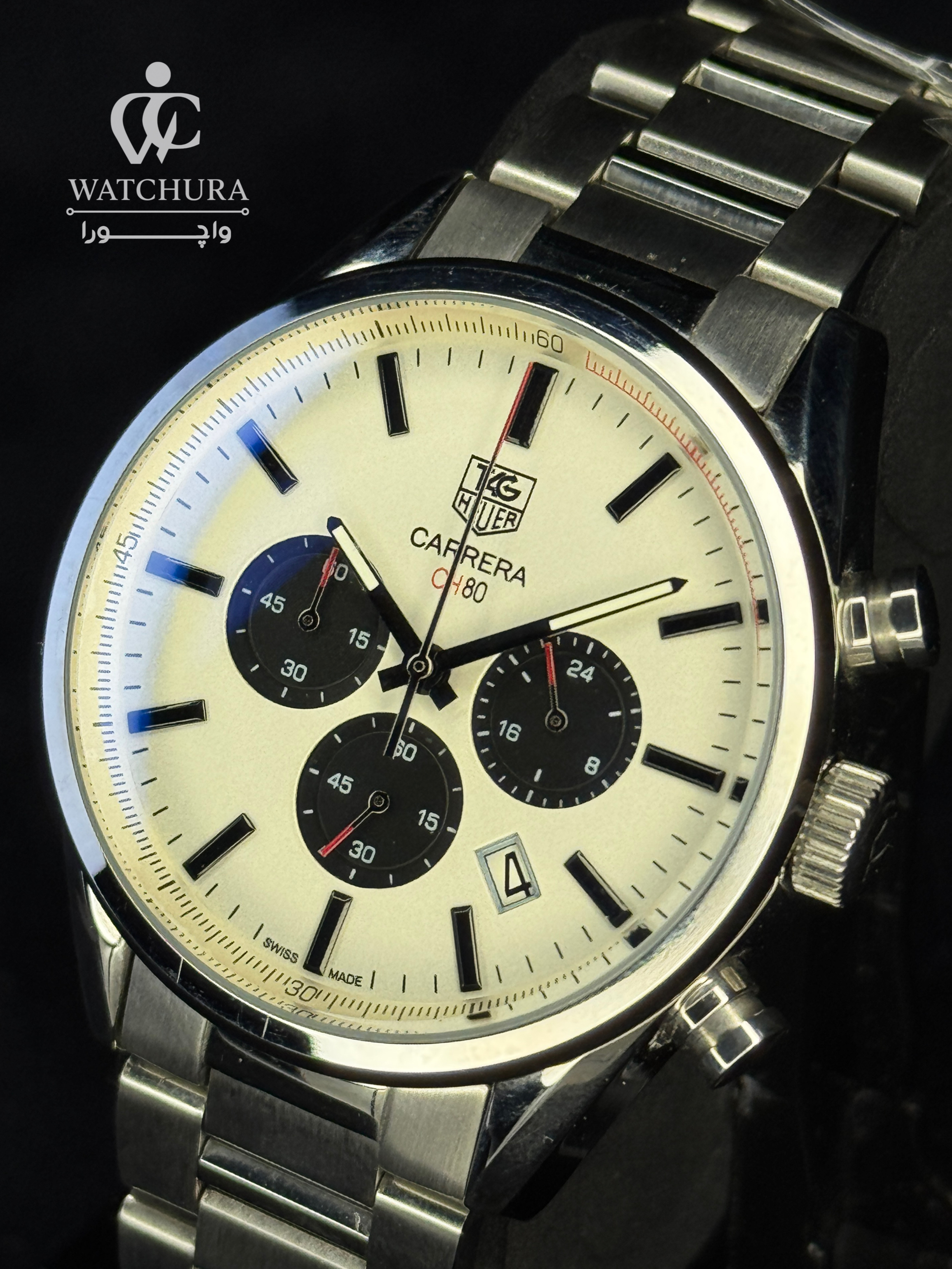 ساعت تگ هویر کارهرا CH80، ادای احترامی به میراث باشکوه این برند در دنیای اتومبیلرانی کلاسیک است. طراحی این ساعت با صفحه سفید مایل به کرم و سه زیرصفحه مشکی تضاد چشمنوازی ایجاد کرده که به استایل «پاندا» مشهور است و یکی از محبوبترین طراحیها میان کلکسیونرها محسوب میشود. جزئیات قرمز رنگ روی عقربههای کرنوگراف، روح ورزشی و هیجان مسابقات را به این قطعه لوکس تزریق کرده است. بدنه صیقلی و بند استیل خوشساخت، این مدل را به یک ساعت همهکاره تبدیل کرده که هم با استایلهای رسمی و کتوشلوار و هم با پوششهای کژوال و شیک، هماهنگی خیرهکنندهای دارد.