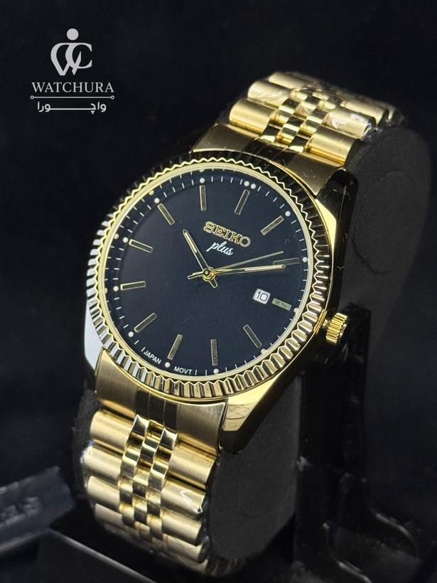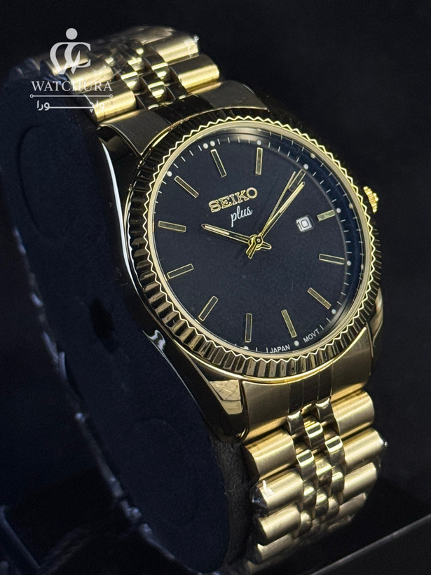 این مدل از سیکو پلاس، ادای احترامی به یکی از محبوبترین طراحیهای تاریخ ساعتسازی است. ویژگی خیرهکننده این ساعت، قاب کنگرهدار (Fluted Bezel) طلایی آن است که با انعکاس نور، درخششی دوچندان به مچ دست میبخشد. ترکیب صفحه مشکی مات با نشانگرهای طلایی و تقویم در موقعیت ساعت ۳، توازنی بینقص میان ابهت و کارایی ایجاد کرده است. این ساعت با بند مدل "جوبیلی" و موتور دقیق ژاپنی، انتخابی ایدهآل برای آقایانی است که به استایلهای کلاسیک، باوقار و اصیل علاقهمندند و میخواهند در مراسمهای رسمی و جلسات کاری، نگاهها را به خود خیره کنند.
