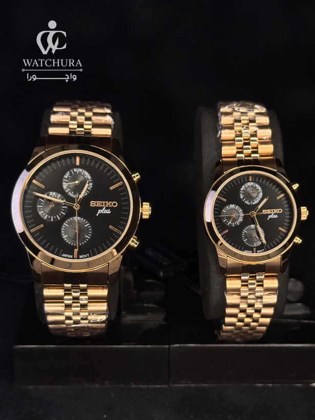 این ست ساعت سیکو پلاس، اوج درخشش و هماهنگی را برای زوجهای شیکپوش به ارمغان میآورد. ترکیب بدنه و بند رزگلد با صفحه مشکی ، تضادی اشرافی و با ابهت ایجاد کرده که در هر محفلی خیرهکننده است. برخلاف مدلهای ساده، هر دو ساعت مردانه و زنانه در این ست مجهز به سه زیرصفحه فعال هستند که نمایشگر تقویم کامل (روزهای هفته و ماه) و ساعت ۲۴ ساعته را ارائه میدهند. این مجموعه با بهرهگیری از موتور کوارتز ژاپنی و طراحی لوکس خود، هدیهای ارزشمند و ماندگار برای مناسبتهای خاص مانند سالگرد ازدواج یا هدیه عروسی است.
