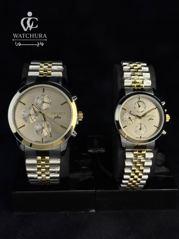 این ست ساعت سیکو پلاس، اوج درخشش و هماهنگی را برای زوجهای شیکپوش به ارمغان میآورد. ترکیب بدنه و بند سیلور-طلایی با صفحه طوسی ، تضادی اشرافی و با ابهت ایجاد کرده که در هر محفلی خیرهکننده است. برخلاف مدلهای ساده، هر دو ساعت مردانه و زنانه در این ست مجهز به سه زیرصفحه فعال هستند که نمایشگر تقویم کامل (روزهای هفته و ماه) و ساعت ۲۴ ساعته را ارائه میدهند. این مجموعه با بهرهگیری از موتور کوارتز ژاپنی و طراحی لوکس خود، هدیهای ارزشمند و ماندگار برای مناسبتهای خاص مانند سالگرد ازدواج یا هدیه عروسی است.