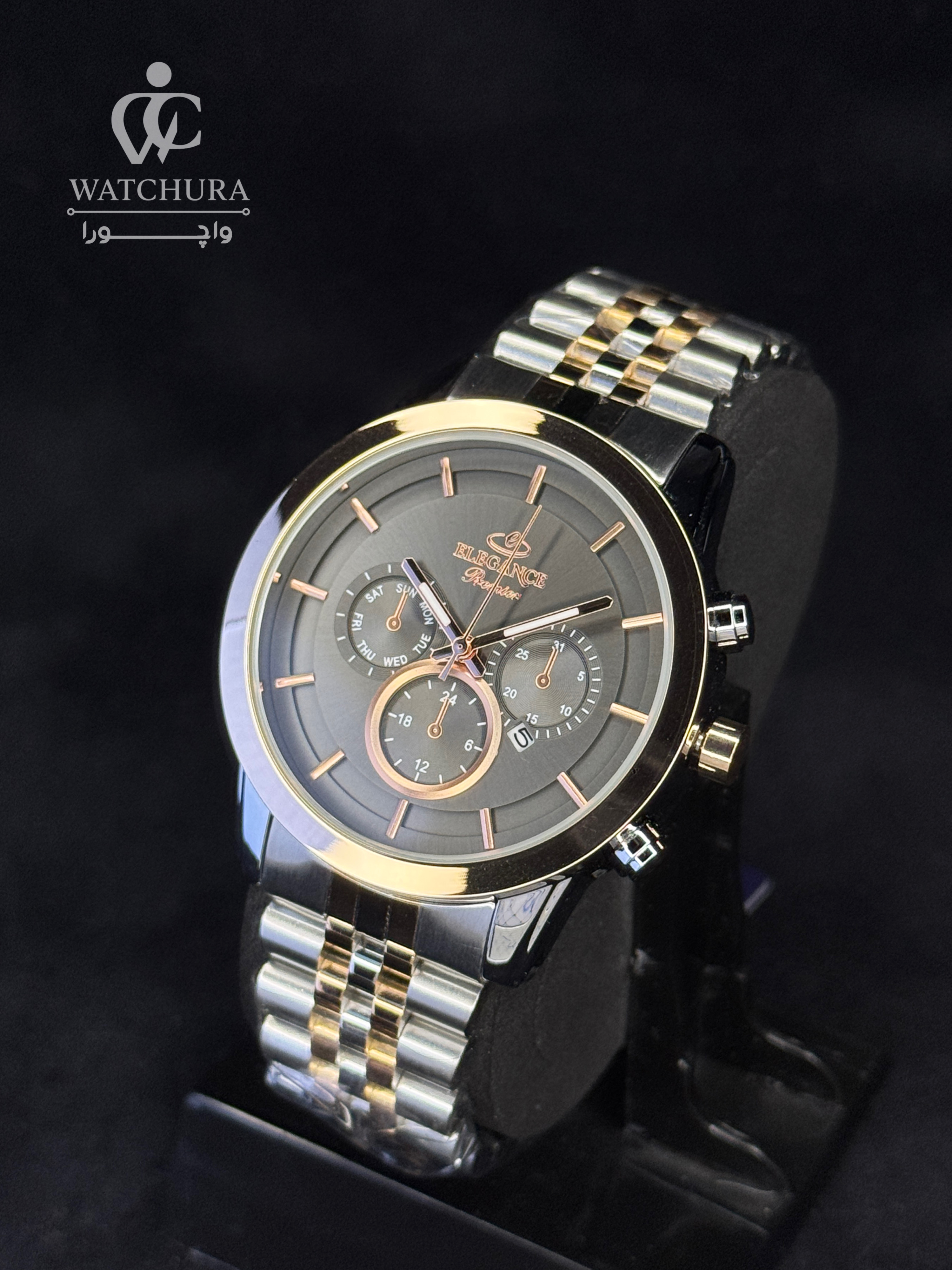 دستهبندی: الگانس (Elegance)برند: الگانس (Eleganca)جنسیت: مردانهنوع موتور: کوارتز (باتری) تک موتورهفرم قاب و بند: گرد، تمام استیل ضد زنگابعاد قاب (قطر) : ۴۴ میلیمتر (سایز استاندارد مردانه)کالیبر موتور : PC ساخت ژاپنجنس شیشه : معدنی (Mineral Crystal)مقاومت در برابر آب : مقاوم در برابر پاشش آب روزمرهرنگ صفحه (Dial) : سیلوررنگ بند : سیلور-طلایینمایش بیشتر