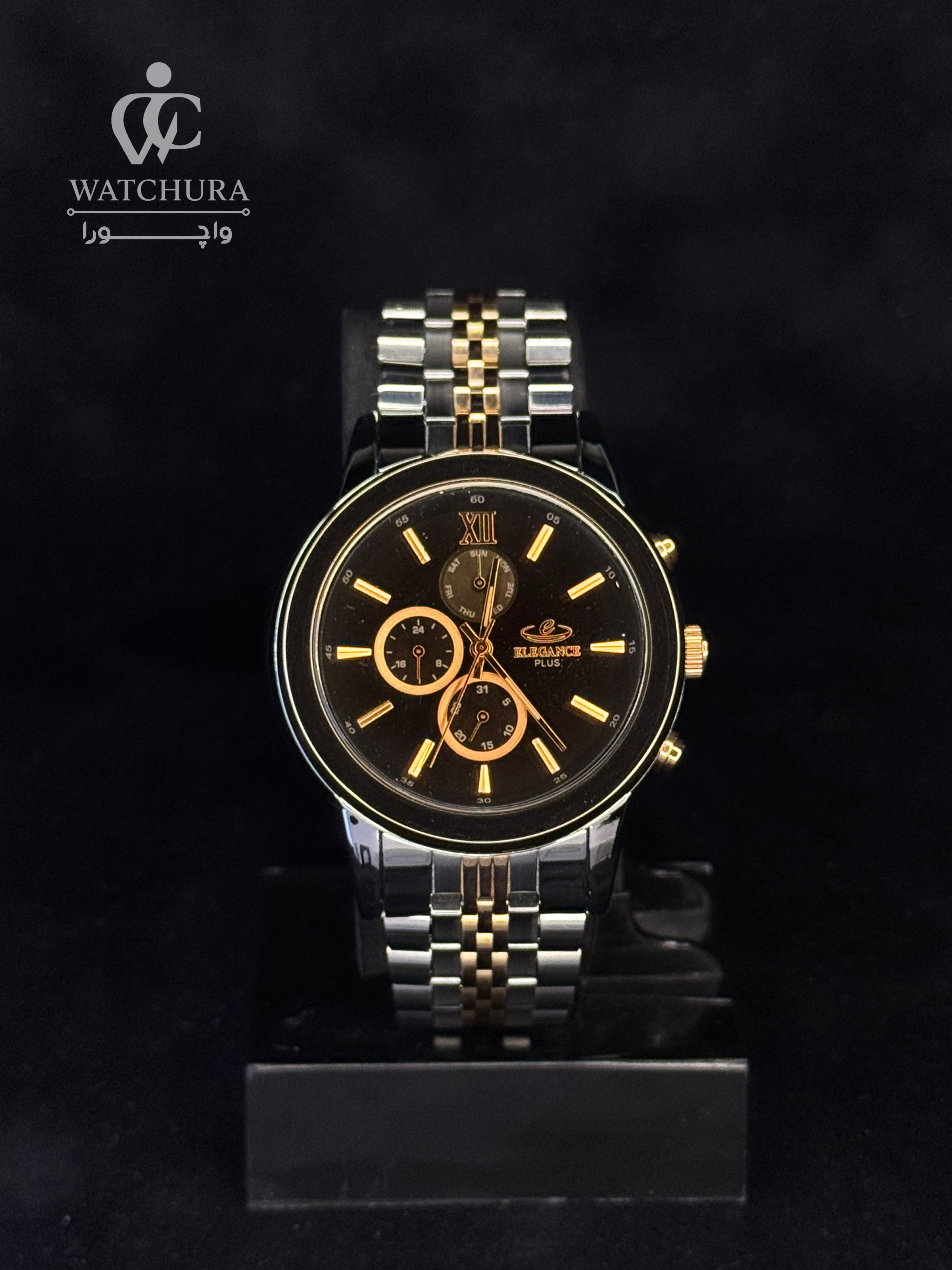 ساعت مچی مردانه الگانس پریمیر (Elegance Premier) کوارتز طرح کرنوگراف استیل-طلایی (صفحه مشکی)